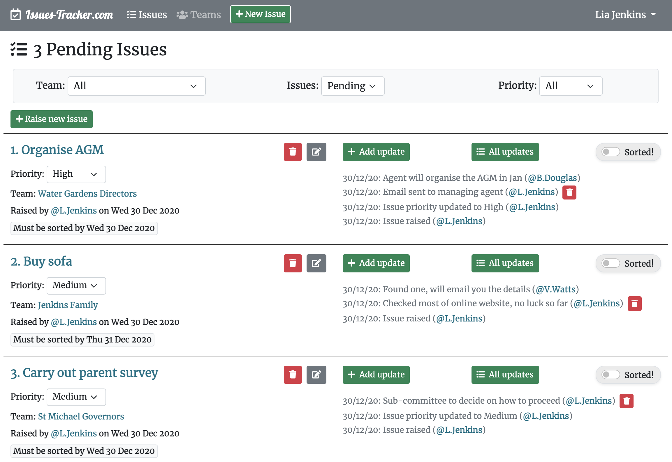 Simple app for managing "issues". Useful for small teams to track progress on various action points. Optional deadlines and issue priority. Weekly automatic email updates.